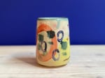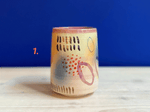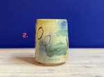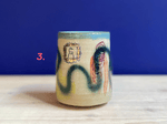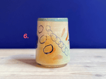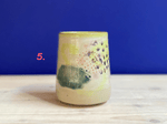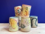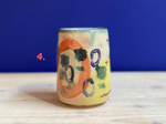 Die Becher von Alexandra Stein aus Halle werden aus hellem Ton frei an der Scheibe gedreht, mit Farbkörpern, Engobe, farbigen & transparenten Glasuren, Lüster & Gold dekoriert (ja, alles händisch gezeichnet) und insgesamt dreimal gebrannt. Empfehlung: Spülen per Hand :)