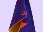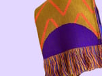 Die eine Seite kariert in Lila und Blau, die andere mit neonorangen Wellen auf mustardfarbigem Grund, dazu Dreieck, Kreise & 👀 in den besten Farben, natürlich inklusive bunter Fransen.